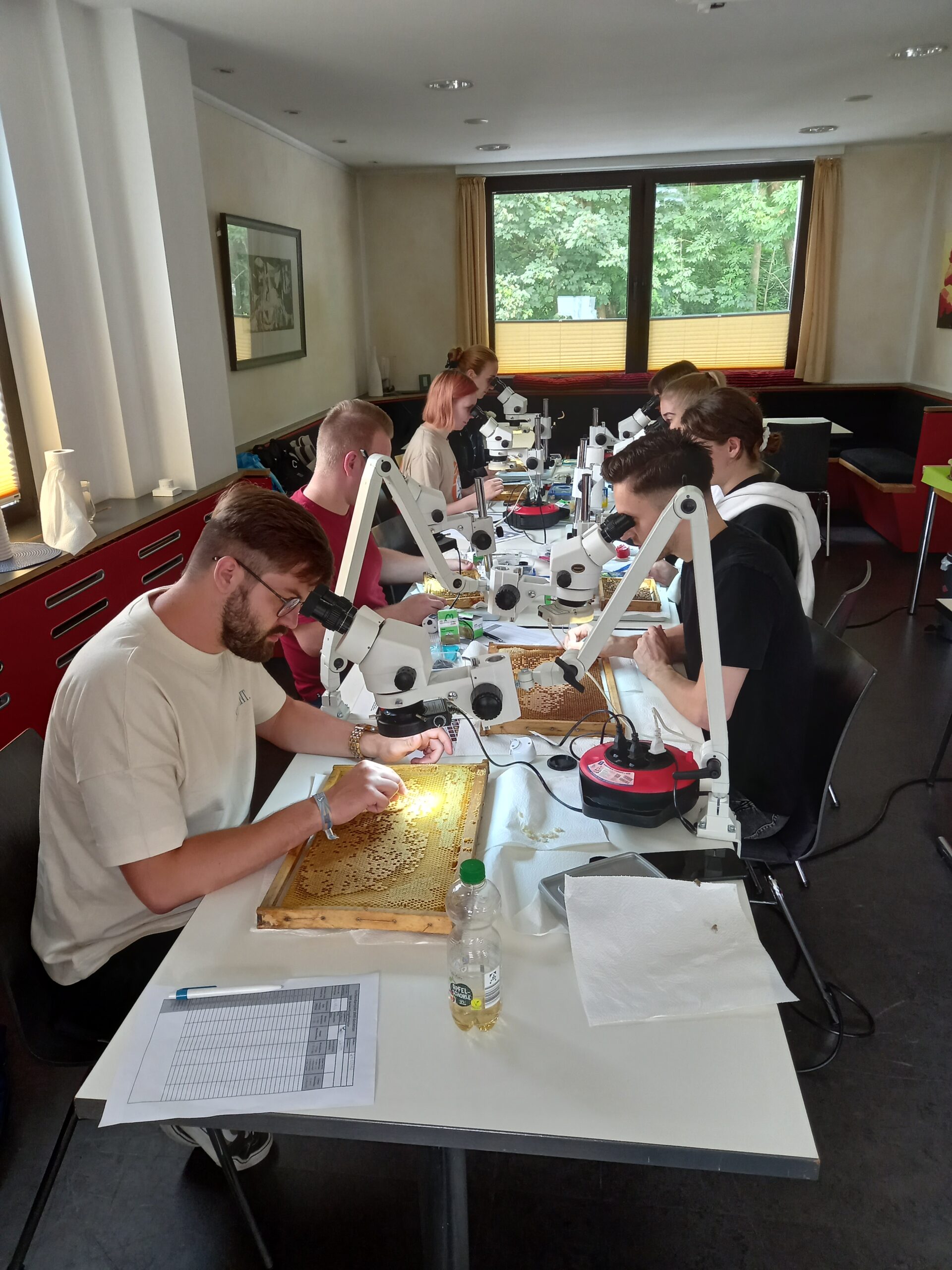 Bei unserem Treffen im März beschlossen wir, einen Teil der Königinnen in Wirtschaftsvölker einzuweiseln und diese ohne Behandlung überwintern zu lassen. Im kommenden Jahr planen wir, bei diesen Völkern eine Milbenzählung durchzuführen, um die Resistenz gegen die Varroamilbe zu bewerten. Dank der Unterstützung des Landesverbandes haben wir bereits vier Schwenkarme für unsere Binokulare erhalten, mit denen wir große Waben komfortabel auszählen können.