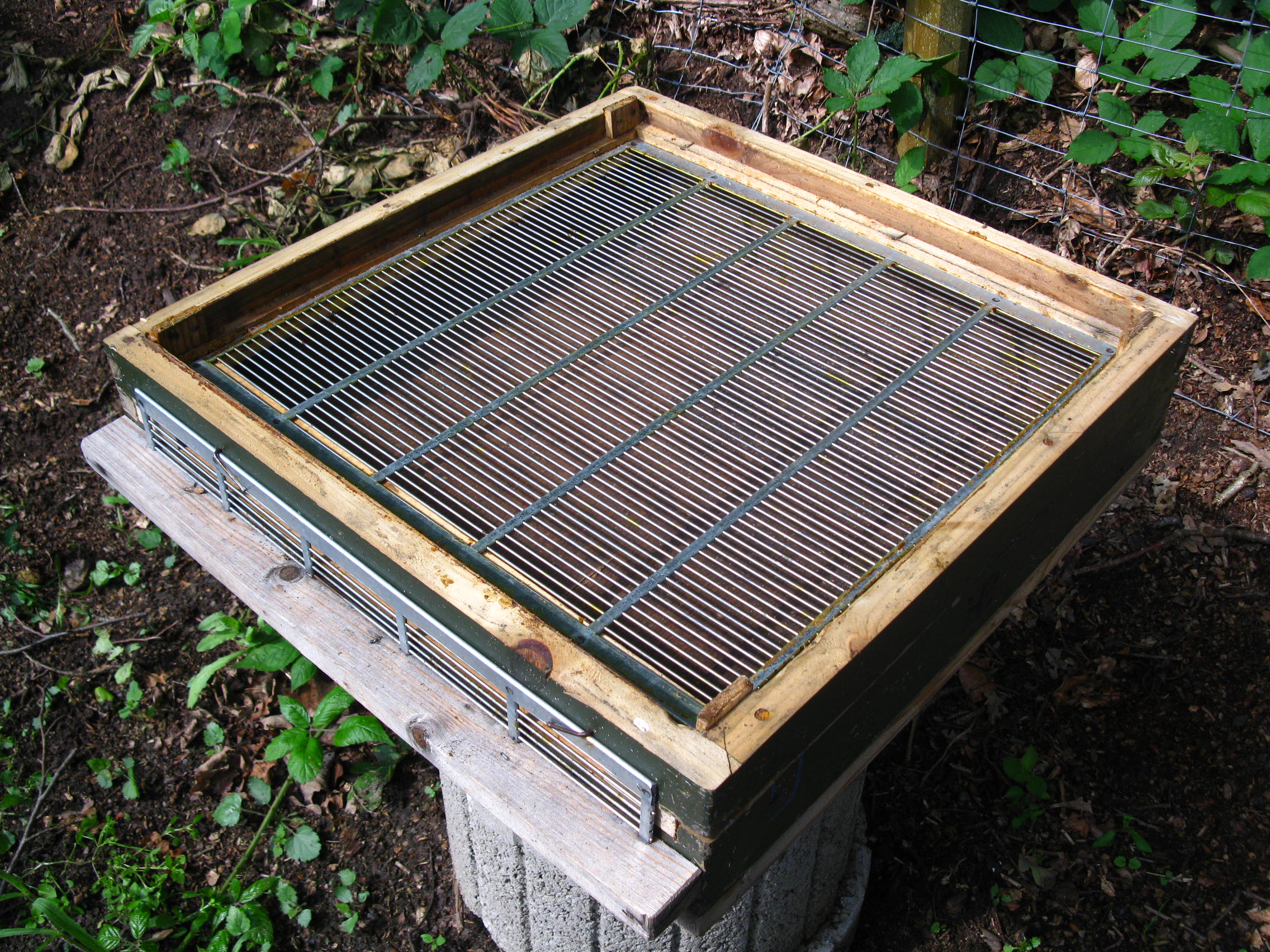 5 Tage vor dem Schlupf der Drohnen wurden 3 Brutableger mit je 6 – 8 Dadant Brutwaben gebildet. Das Besondere ist der hohe Boden für die Drohnenableger. Er hat direkt hinter dem Flugschlitz eine senkrechte Leiste die bis 10 mm über den geschlossenen Boden reicht. Der gesamte Raum hinter dieser Leiste, wird mit einem Drohnenabsperrgitter abgedeckt. Der Flugschlitz wird außen ebenfalls mit einem Drohnengitter versehen.