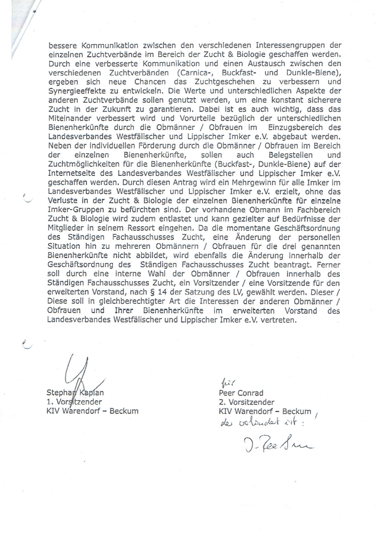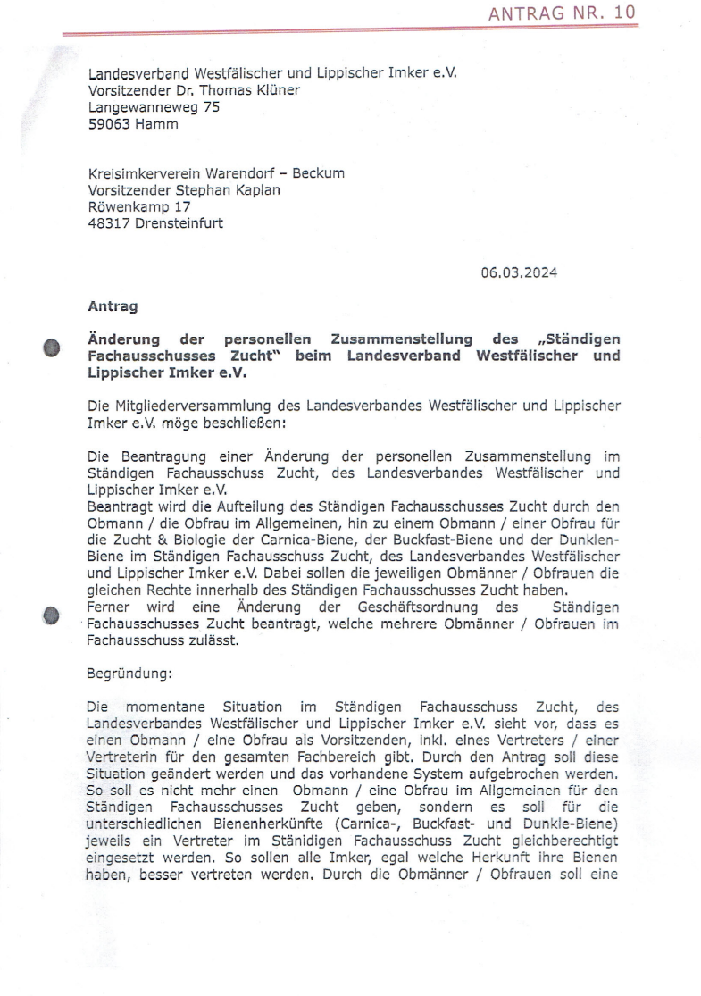 folgender Antrag wird am 20.04.2024, bei der Vertreterversammlung des Landesverbandes Westfälischer und Lippischer Imker e.V., in Haus Düsse, Haus Düsse 2, 59505 Bad Sassendorf zur Abstimmung gebracht.