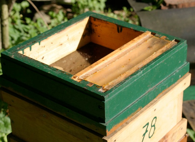 Wer seine Könignzucht mit der MINI-Beute startet, beginnt mit dem „Befüllen“ der Beuten schon sinnvoller Weise im Sommer des Vorjahres. Hierzu werden 6 Rähmchen mit Mittelwänden, ausreichend junge Bienen (von etwa 3 Zander- oder 2-Dadantbrutwaben) und eine begattete Königin in die Beute gegeben. Also wie ein kleiner Kunstschwarm. Hierbei kann die Königin ruhig älter sein, da sie ja nur zur Überwinterung der Einheit gebraucht wird. Damit die Mittelwände zügig ausgebaut werden, setzt man einen Futtertrog mit ca. 2L Flüssigfutter (Honiglösung oder Zuckerwasser 1:1) auf.