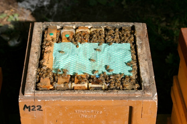 Sollte eine Königin nach 4 Tagen nicht in des Trachtvolk übergewechselt sein (Nachschau im MINI), wird sie abgefangen und über das Zentralbohrloch in das Trachtvolk einlaufen lassen. Falls die MINI-Beuten danach noch (um die Brut leer laufen zu lassen) auf dem Trachtvolk verbleiben, muss über das Zentralbohrloch ein Absperrgitter gelegt werden, damit die Königin nicht mehr nach oben wandern kann.